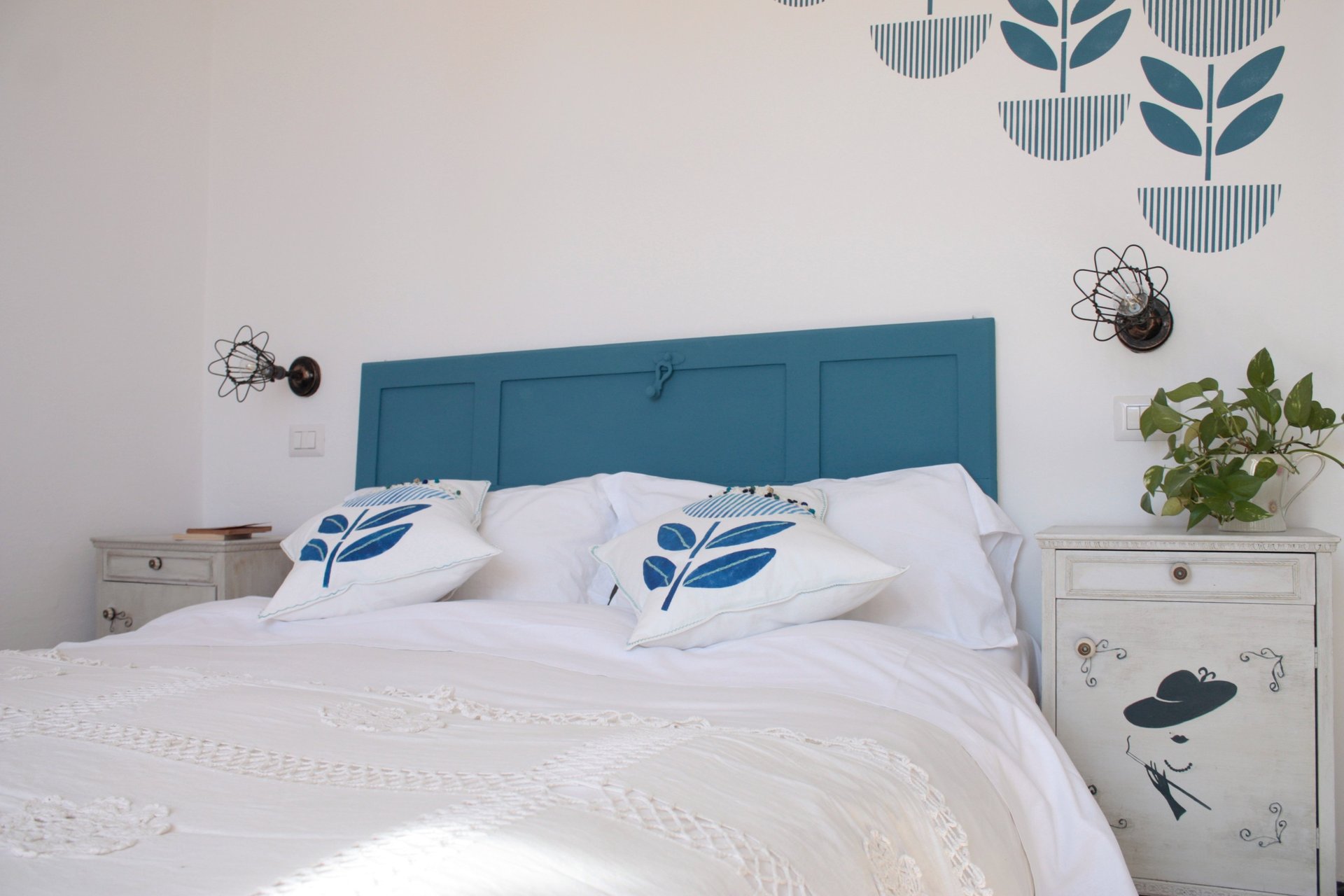 La parete blu dona eleganza e tranquillità, mentre gli arredi – recuperati, restaurati e reinterpretati da Flor – raccontano la nostra passione per il design sostenibile e gli oggetti con una storia.