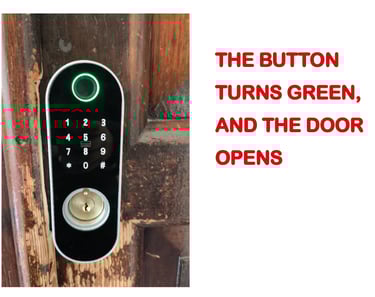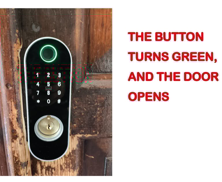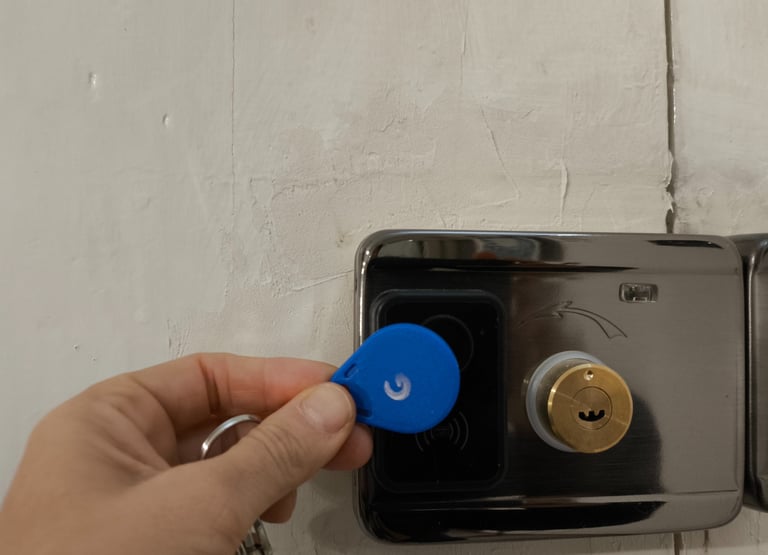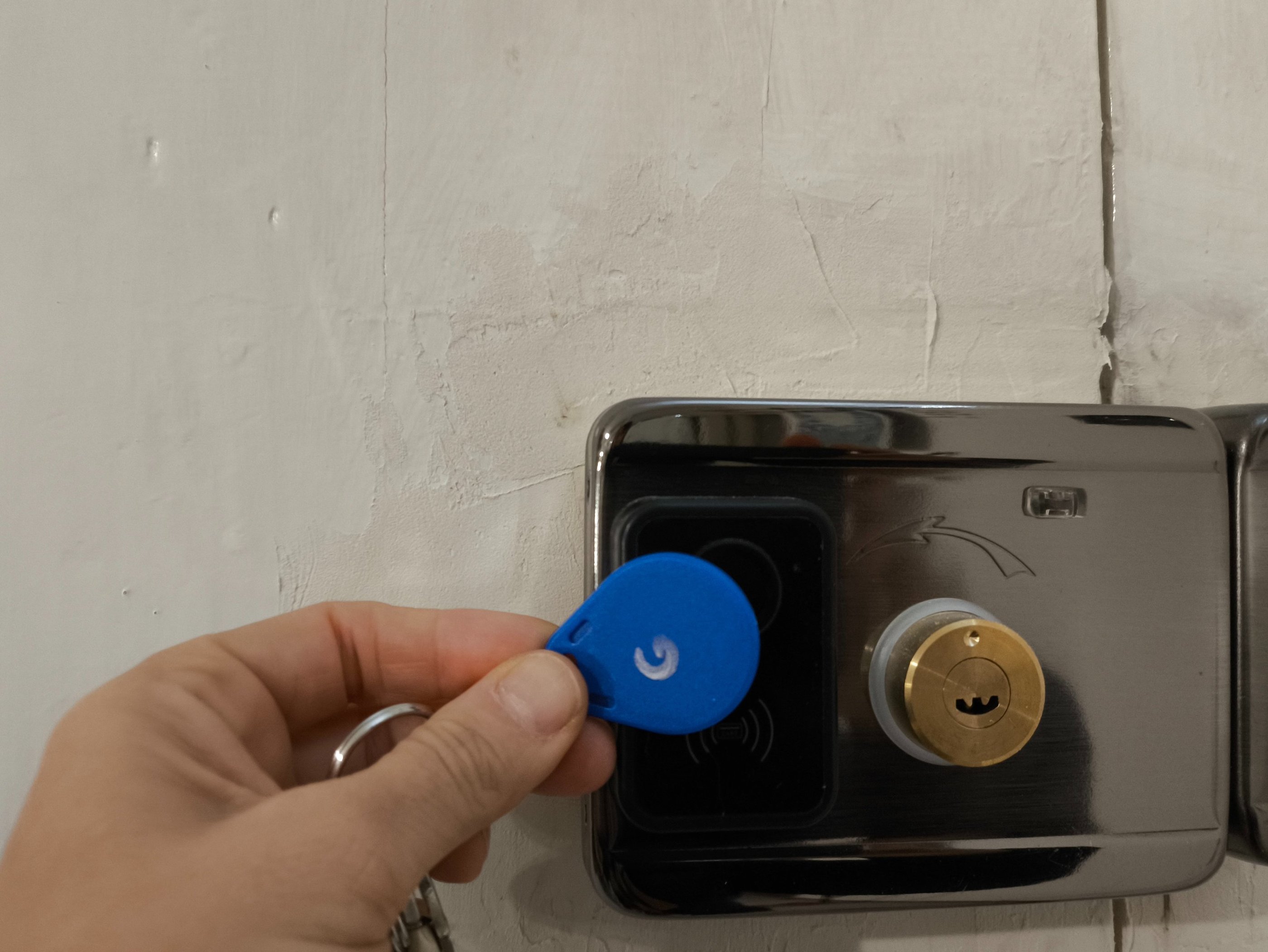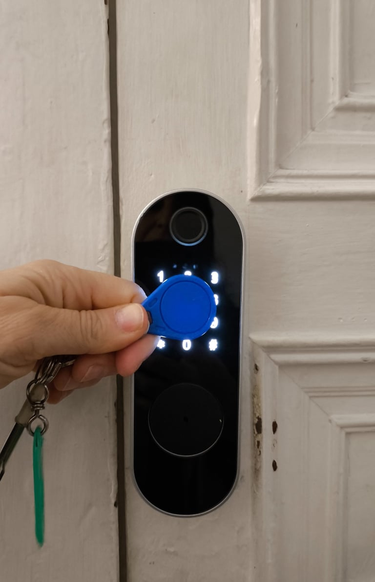 You will also find a blue key fob, which allows you to open the guesthouse entrance door both from the inside and from the outside. Simply place the key fob on the reader and the door will open.