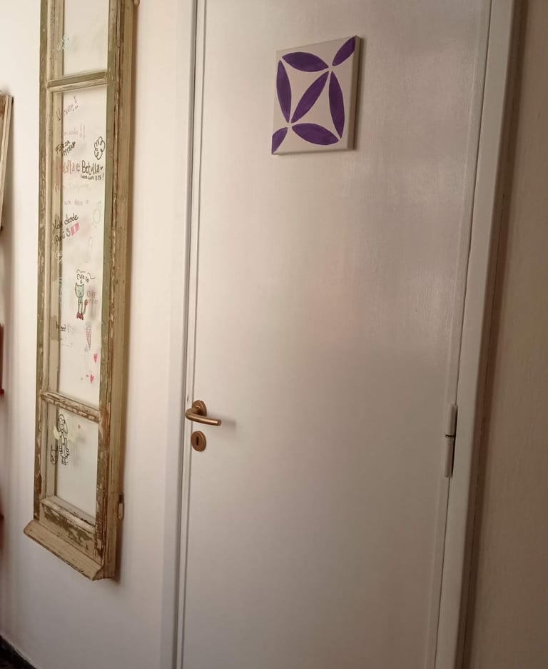 When you enter to the apartment, go straight and turn in your right, your room is the first door at your left, with a VIOLET SYMBOL.